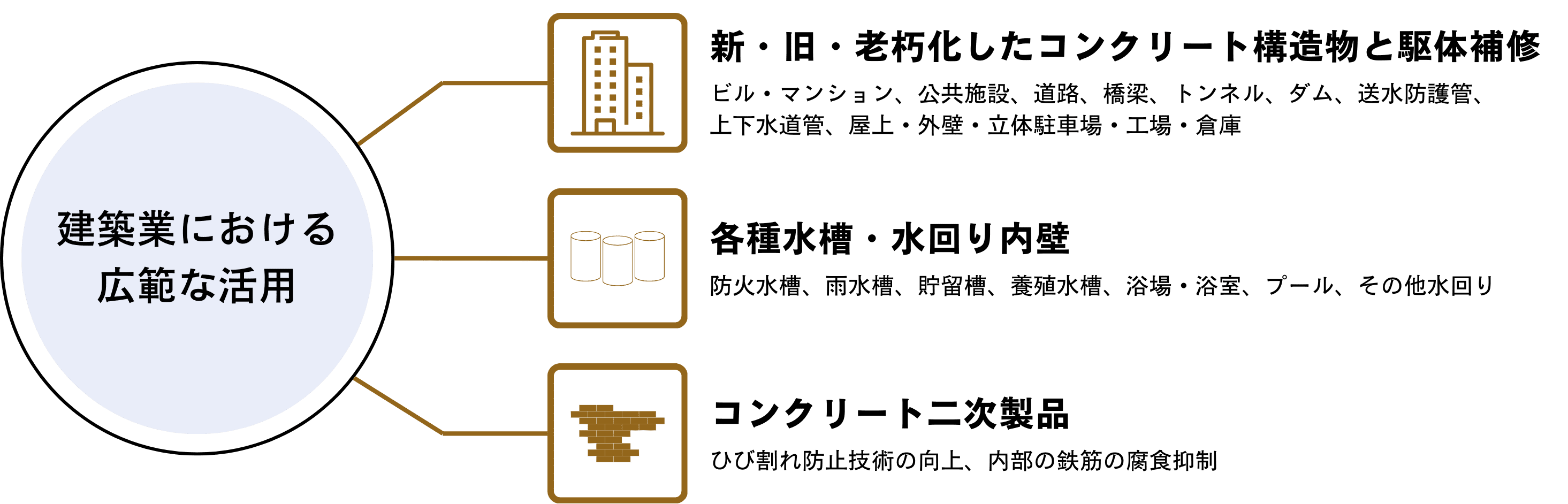 新旧のコンクリートに塗布するだけで、自己修復機能を持つ防水コンクリートへと変わり、劣化を防ぎ、ジオポリマー効果により安定した高い耐久性を維持します。